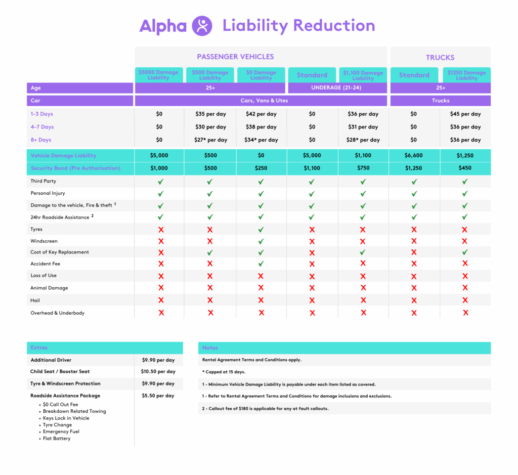 You can significantly reduce your excess liability, potentially to as low as $0 (Zero Liability), by selecting one of Alpha Car Hire’s optional protection packages at the time of booking or vehicle collection. These packages are designed to give you peace of mind and limit your financial exposure in the event of an accident or damage to the rental vehicle. Our team can explain the different options available to help you choose the best coverage for your needs.